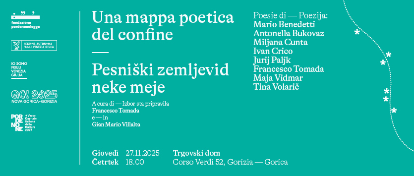 Una mappa poetica del confine / Pesniški zemljevid neke meje include un itinerario di poesie e luoghi legati a otto autori e autrici di confine, caratterizzati da voci e timbri poetici significativi e qualificati, tutti capaci di esprimere, attraverso la loro opera, i territori che hanno vissuto e abitato. Sono Mario Benedetti, che nei suoi versi ha dato voce alla vasta area  che spazia da Nimis a Cividale, da Taipana a Bovec, al Triglav; Tina Volarič, per sorvolare idealmente l’Alto Isonzo, Tolmino e Santa Lucia d’Isonzo; Miljana Cunta, per muoverci fra  San Pietro, Nova Gorica, la grotta Vilenica e  Lipica; Antonella Bukovaz, che farà spaziare il nostro sguardo fra Topolò, La Benecia, Il Matajur, I Prati di Tribil; Francesco Tomada, per esplorare il territorio fra Corno di Rosazzo, La Piana del Preval, Gorizia, Nova Gorica e Vertoiba; Jurij Paljk, per viaggiare fra Velike Žablje, Valle del Vipacco, Il Carso, Trieste e Terzo di Aquileia; Maja Vidmar, con un itinerario fra  Nova Gorica, Salcano, San Daniele del Carso e Canal; e Ivan Crico: con i suoi versi ci addentreremo nella Bisiacaria, da Fogliano a Sagrado, Doberdò del Lago, Ronchi dei Legionari. Alla presentazione di Gorizia interverranno, oltre ai curatori Gian Mario Villalta e Francesco Tomada, i poeti Ivan Crico, Antonella Bukovaz, Miljana Cunta. Il progetto è sostenuto dalla Regione autonoma Friuli Venezia Giulia – Assessorato alla Cultura nell'ambito di GO! 2025.